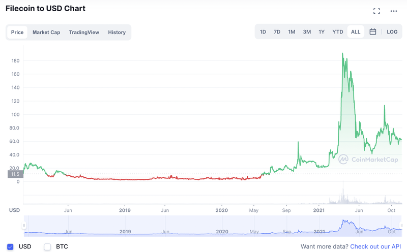 Filecoin的价格曾在4月1日达到历史最高价237.24美元,相比年初翻超十倍,价格目前已回落至60美元左右。
