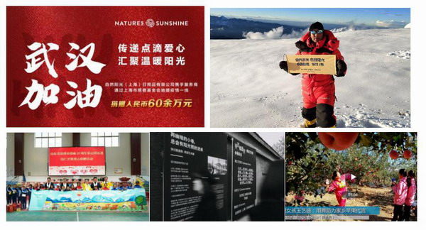 “全员抗疫,关爱天使”。新冠疫情肆虐之初,自然阳光于2020年1月底联手服务商及员工通过上海市慈善基金会累计捐赠善款总额60余万元,用于支援疫情严重地区的病患和一线医护人员。同年3月,自然阳光积极响应号召,参与“向援鄂抗疫的医务人员致敬”活动,向安徽省红十字会捐赠价值20余万元的产品致敬辛勤的白衣天使。