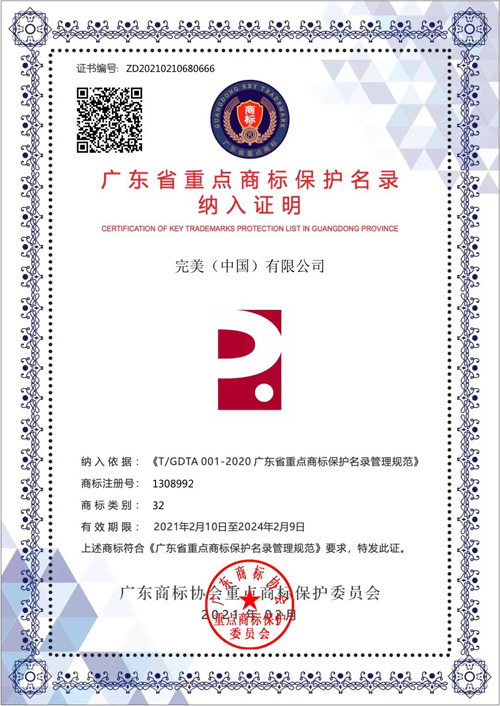 近日,经广东商标协会重点商标保护委员会严格评审,完美公司2件核心商标被纳入首批广东省重点商标保护名录,这是广东省商标领域对于我司商标价值管理、法律保护、规范运用效果的肯定,彰显了完美公司对商标品牌建设与知识产权管理的高度重视和优秀成果。