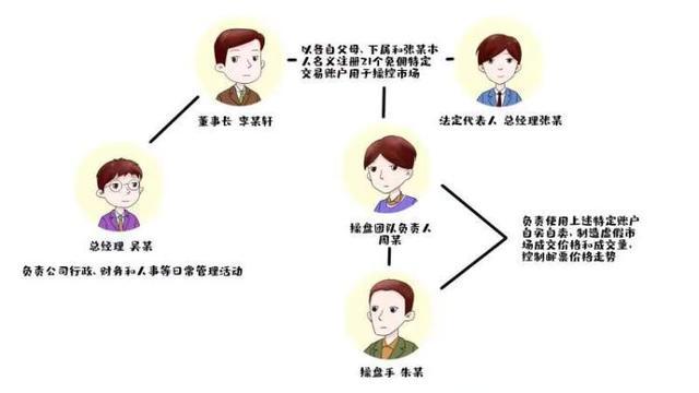 该团伙分工明确,李某轩、张某是董事长和法定代表人,共同出资成立公司,并以各自父母、下属和张某本人名义注册21个免佣特定交易账户用于操控市场;被告人吴某作为涉案公司总经理,负责公司行政、财务和人事等日常管理活动;被告人周某作为操盘团队负责人,被告人朱某等作为操盘手,负责使用上述特定账户自买自卖,制造虚假市场成交价格和成交量,控制邮票价格走势,致使客户高价位购入邮票,再根据李某轩、张某指令反向高抛低买。