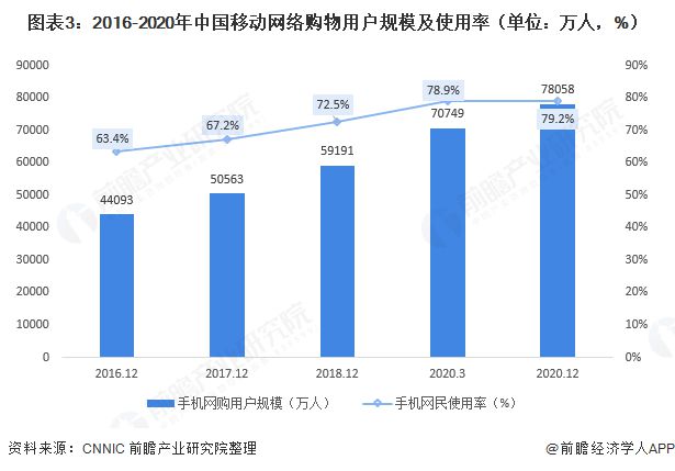 截止2020年底,我国手机网络购物用户规模达78058万人,较2020年3月增长7309万人,占手机网民规模的79.2%。