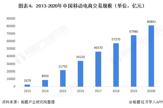 移动端一直作为电商平台发展重要渠道,随着近年直播电商市场爆发,移动电商交易规模继续升级。数据显示,从2013年的2679亿元到2019年的67580亿元,中国移动电商市场交易额持续增长。2020年中国移动电商市场交易额预计突破八万亿元。