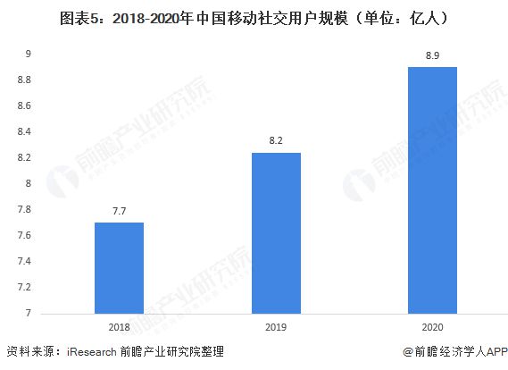 根据艾瑞咨询数据显示,2020年,我国移动社交平台用户数达到8.9亿,较2019年增长8.0%。随着图片社交、声音社交、视频社交等产品形态的创新以及革新,移动社交市场将保持稳健发展态势,用户渗透率稳步增长,社交电商用户基础庞大。