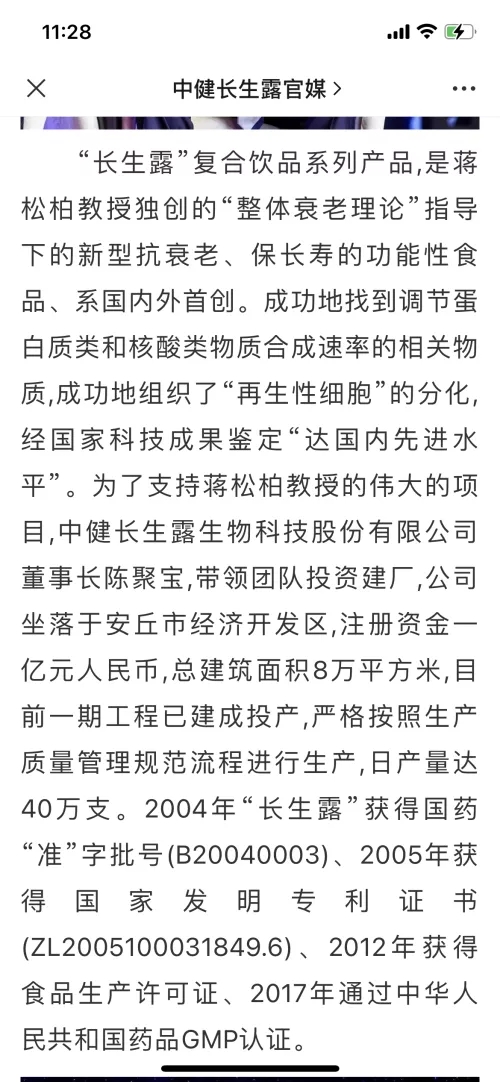 在中健长生露官微中,有信息显示,“长生露”复合饮品系列产品,是蒋松柏教授独创的“整体衰老理论”指导下的新型抗衰老、保长寿的功能性食品、系国内外首创。蒋松柏教授成功地找到调节蛋白质类和核酸类物质合成速率的相关物质,成功地组织了“再生性细胞”的分化,经国家科技成果鉴定“达国内先进水平”。为了支持蒋松柏教授的伟大的项目,中健长生露生物科技股份有限公司董事长陈聚宝,带领团队投资建厂,公司坐落于安丘市经济开发区,注册资金一亿元人民币,总建筑面积8万平方米,目前一期工程已建成投产,严格按照生产质量管理规范流程进行生产,日产量达40万支。2004年“长生露”获得国药“准”字批号(B20040003)、2005年获得国家发明专利证书(ZL2005100031849.6)、2012年获得食品生产许可证、2017年通过中华人民共和国药品GMP认证。