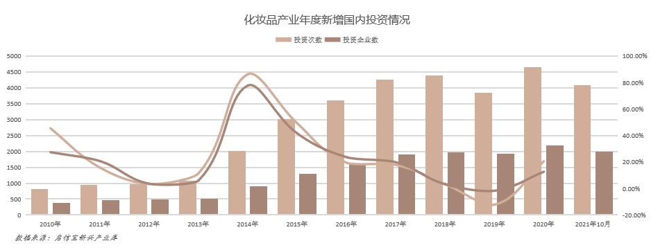 总体来看,中国化妆品产业近10年的年度新增融资次数和融资企业数均呈现“先增后降”趋势,2010-2016年期间每年新增融资次数和融资企业数均逐年增长,新增增速则出现先下降后上升的趋势。2017-2020年,年度新增融资次数、企业数以及新增增速均逐年下降。