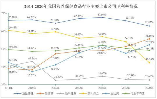 我国营养保健食品行业的利润水平整体较高。根据沪深两市上市公司披露的定期报告,2014-2020年我国营养保健食品行业上市公司历年平均毛利率均保持在48%以上,最近7年毛利率均值为49.90%,行业整体利润水平稳定维持在高位。