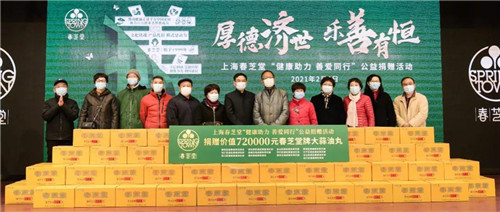 王爱庭总裁特别强调,刚刚迈入2021年,我们又遭遇到新冠疫情挑战,作为一家专注国人健康22年的民族健康企业,用传统中医药养生智慧守护国人健康、推进健康中国是我们的使命与担当;面对反复爆发的疫情,需要国民共克时艰。春芝堂身负不可推卸的社会责任,始终不忘初心,在公益事业、慈善事业上做出表率行动,做有温度的企业,做善行良德的倡导者、行动者和传递者。春芝堂多年来始终秉持扬善、立善、行善的仁爱之心,内化于心,外化于行,从善如流,将“创优争先、利国惠民”的正能量与时代风貌向社会传递,推动知行合一、乐善有恒;在疫情爆发之初就第一时间组织募捐驰援灾区,向武汉协和医院捐赠价值300余万的紧缺医疗物资和健康食品,向上海仁济医院捐赠近百万保健食品。此次将春芝堂明星保健食品捐助给需要的人,不仅是用一份爱心,一份关怀,呵护生命,守护健康,更是要以行动来发起号召,让更多的企业、组织投入进来,用善意大爱回馈社会,助力“健康中国梦”。